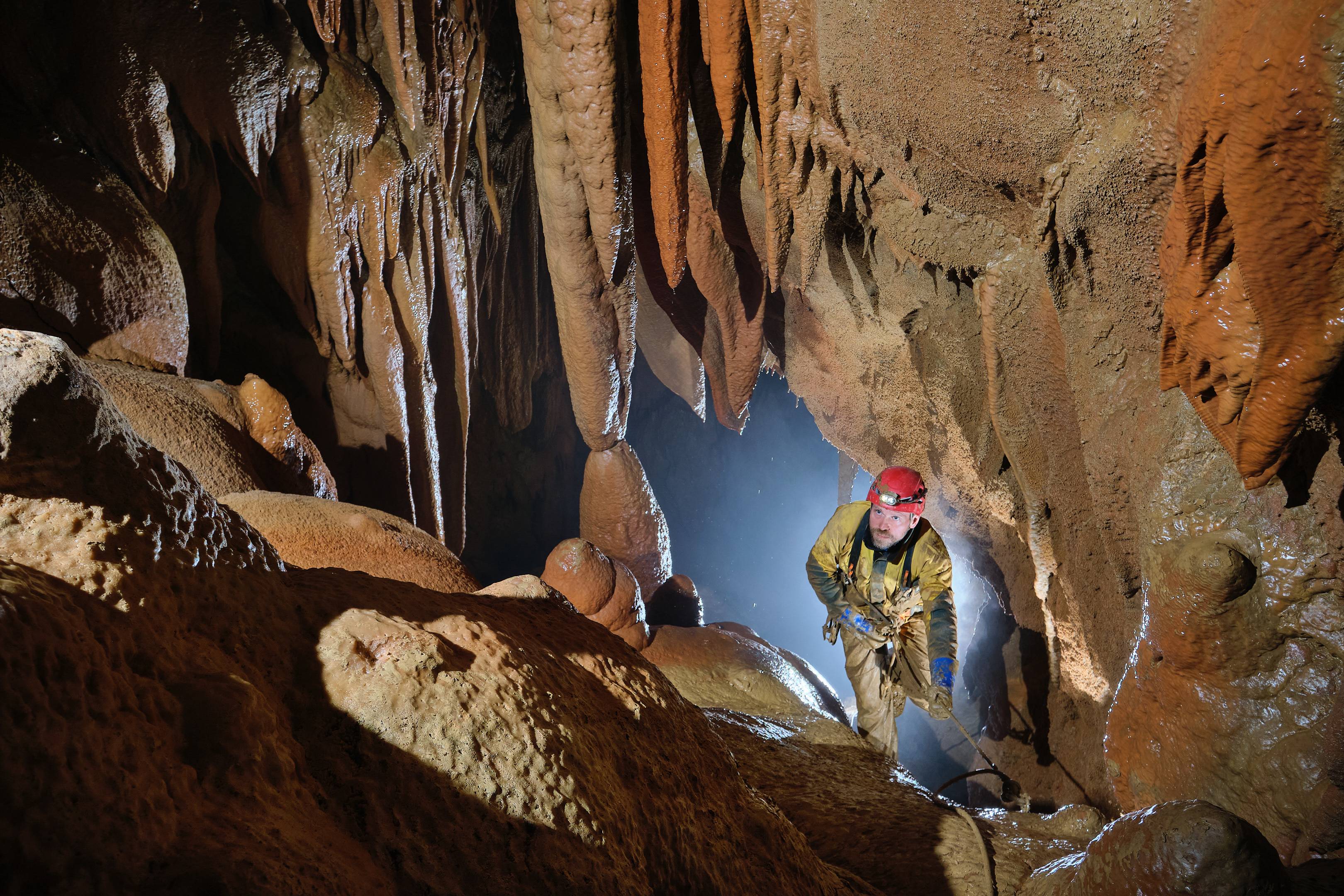 No, v nedeljo pa smo le našli pot v kaninsko podzemlje. Najprej smo se lotili Zvezde danice oziroma po novem – Damekčeve Danice. Lansko leto ji nismo še prišli zares do živega, letos pa nas je dan za dnem puščala praznih rok (beri: zmanjkalo nam je štrika). Na nedeljski akciji smo Božo, Anita, Yana in Erika izmerili jamo od ožine nad Anitinim nihajem do Reharjevih ploščic. Že naslednji dan so Maffi in Poklukarja opremili Anitin nihaj. Koprčani so istočasno širili meander v WC breznu (na cca. -150 m), Pintarji, Erik in Edi so izmerili dve novi jami (11-metrca in Jama pod tremi žicami), del belgijske ekipe (Pierr) pa se je pridružil novomeščanom v Trnuljčici. Edi, Tomaž in Franc so šli v Brezno pod Žičnico in z bivaka na -250 m prinesli 300 m vrvi. Pri tem so se pošteno stuširali in posledično podirali hitrostne rekorde tako ven iz jame kot tudi po smučišču navzgor.